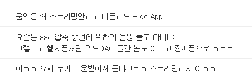 그동안 스마트폰에 넣고다니던 음악파일들을 들고다닐 수 없게된 나는 이 참담한 심정을 조금이나마 위로받고싶어 인터넷 커뮤니티에 토로하였으나 돌아온 답변은